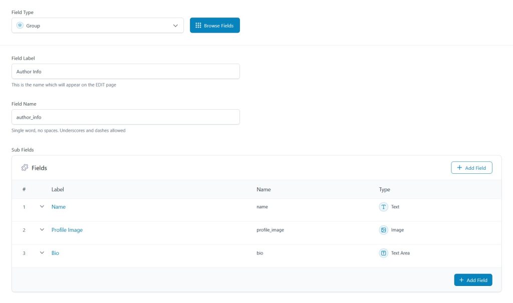 For example, if you have a Group field named “Author Info” that contains sub fields such as Name, Profile Image, and Bio, each of these sub fields will appear as separate, selectable options in the ACF Field block. You can then place and style each sub field anywhere in the block editor, just like regular ACF fields.